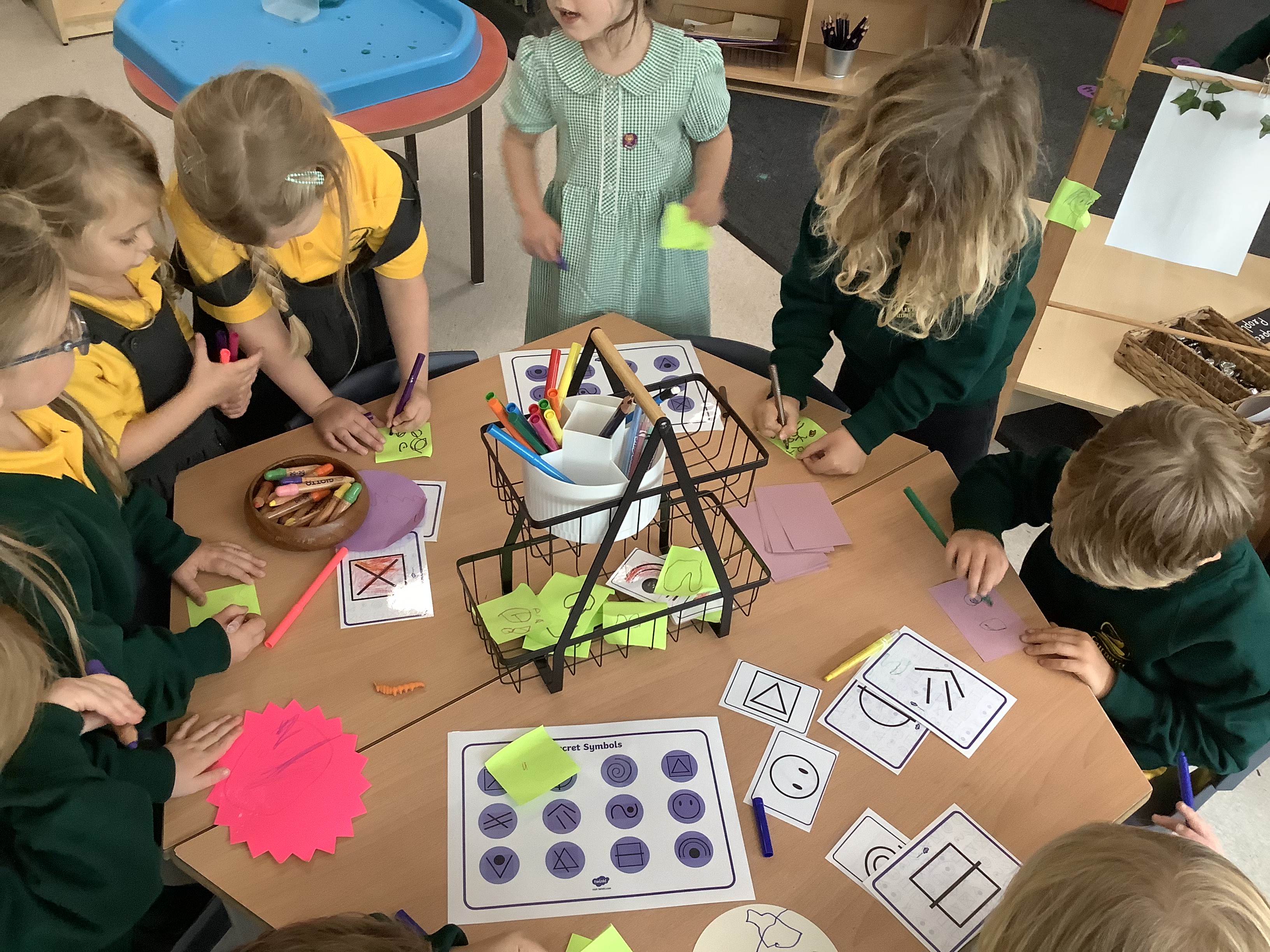 This week we introduced the message centre to the children, we used secret symbols to send messages to each other and we loved hiding and finding notes around the classroom. The teacher's wellies were almost full of secret notes! We even had a visit from Spider-Man who left us a secret message around the classroom so we sent him some secret messages back.